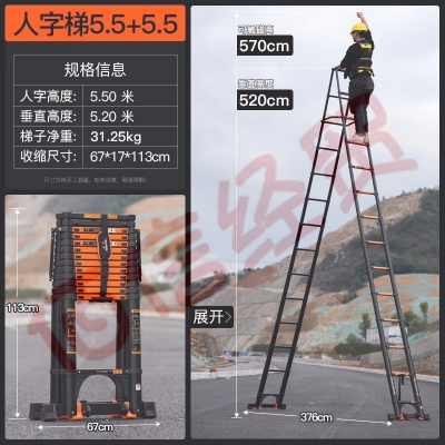 巴芬伸缩梯多功能梯子家用梯人字梯加厚铝合金工程梯升降直梯折叠楼梯 人字梯5.5米【防滑加宽踏板】 自营