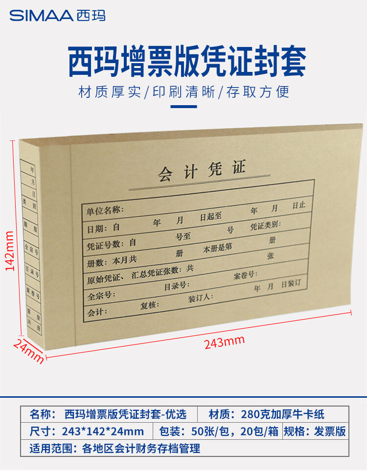 西玛(SIMAA)增票规格连背凭证封面280g加厚牛皮纸发票版记账封皮用友会计记账封面FM128发票版封面243*142*24mm50张/包(五包起售) 自营