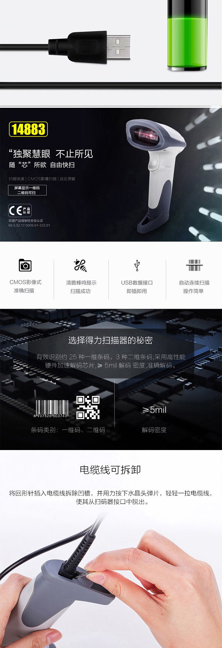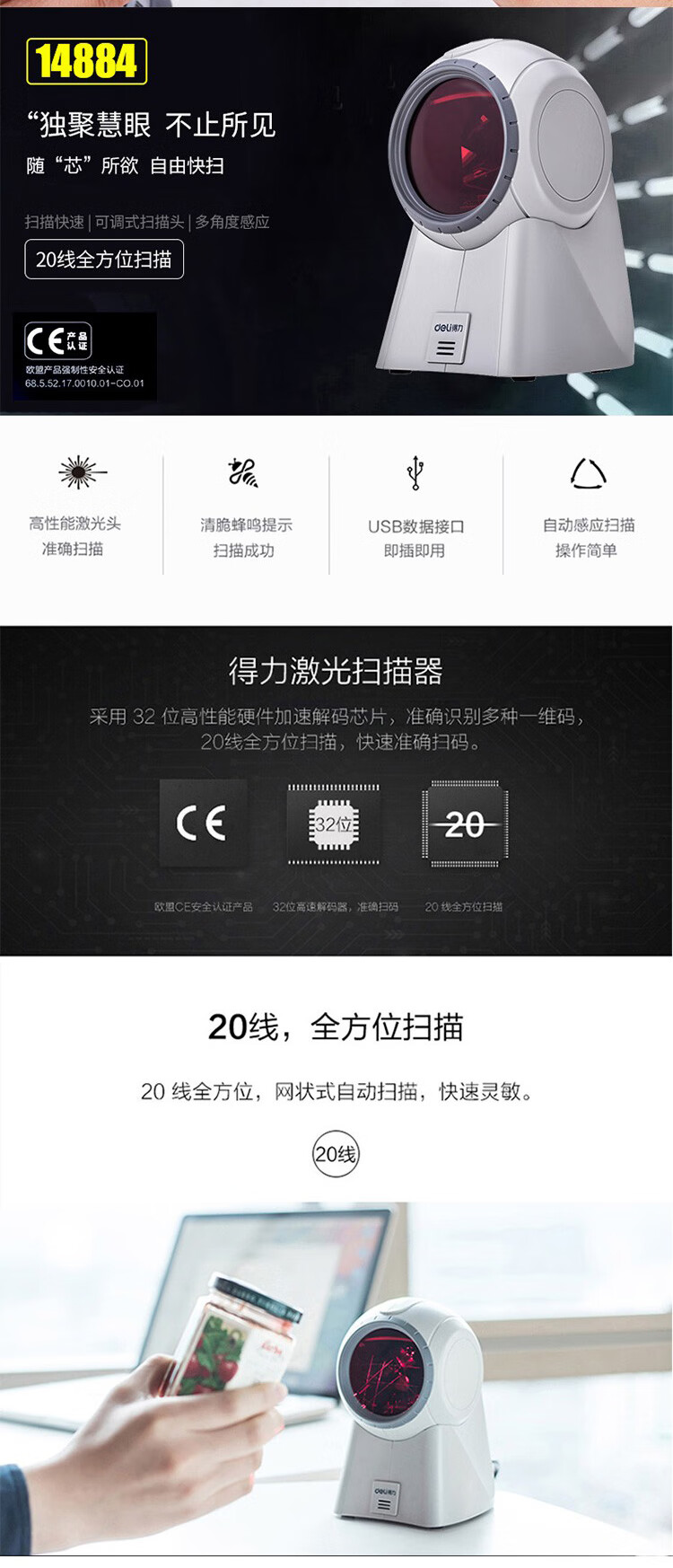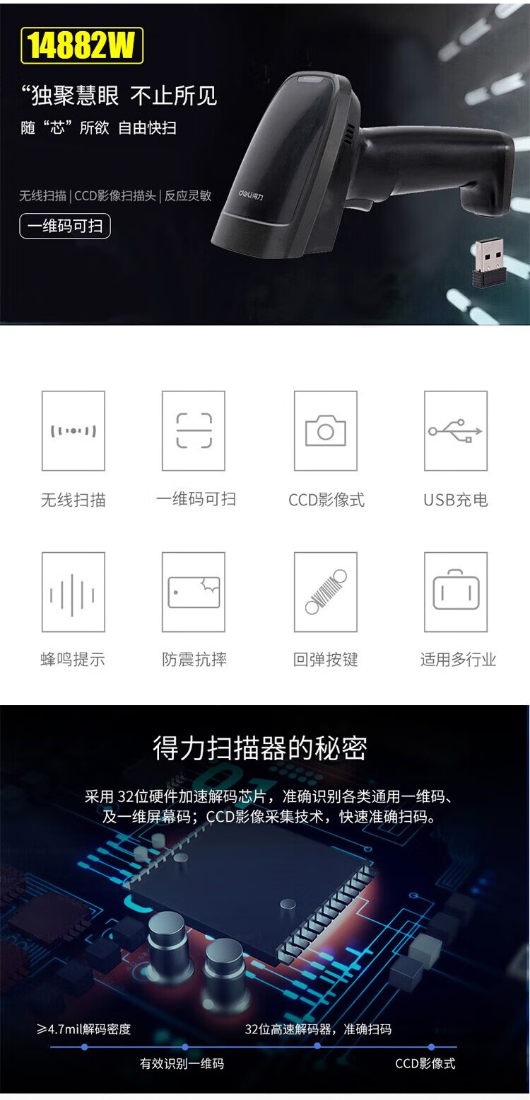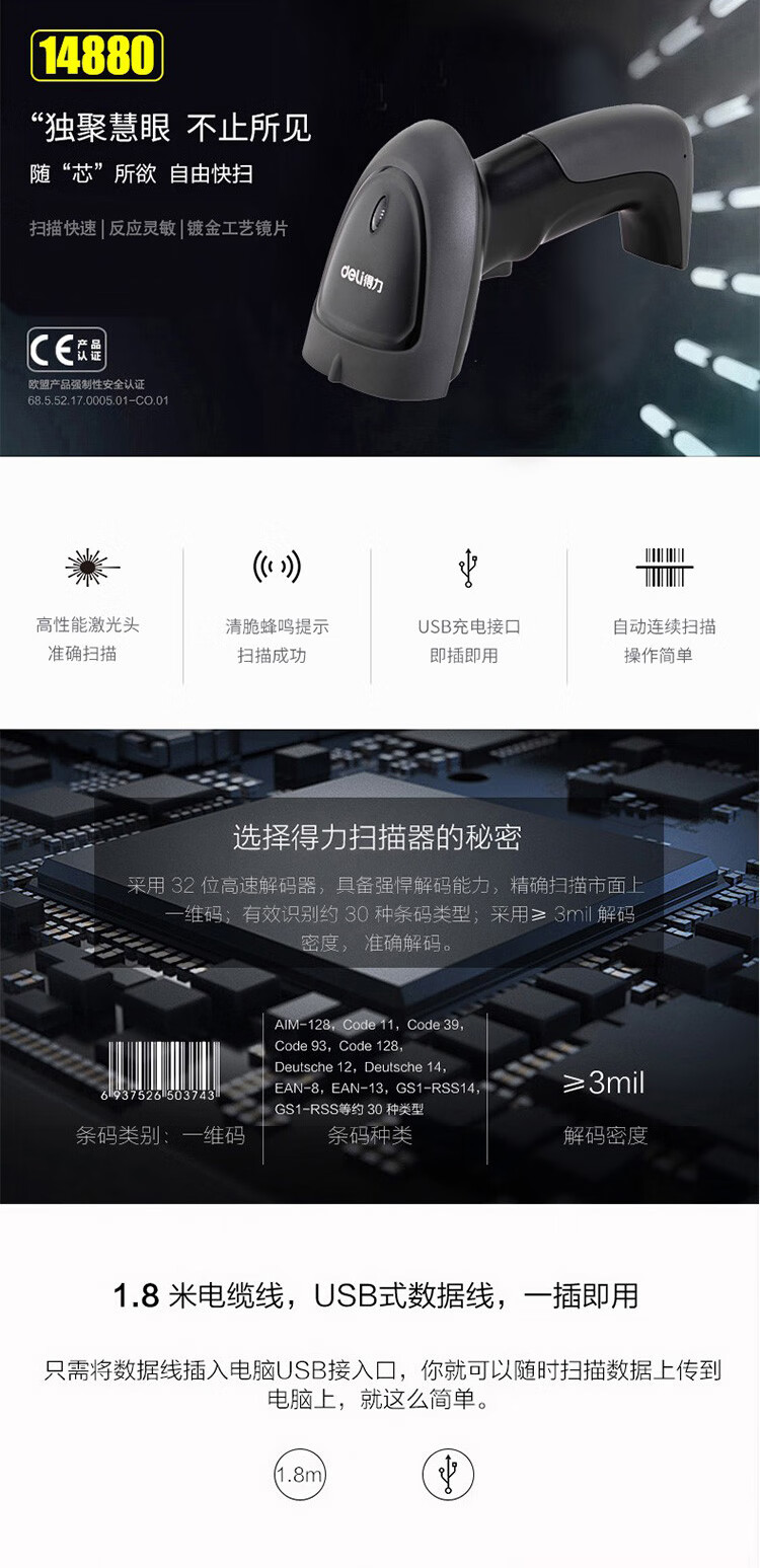 得力(deli)条码扫描枪扫码枪商品条码枪餐饮零售商超仓储物流手机屏幕支付商品扫描器14883有线一二维码手机支付农资扫描 自营