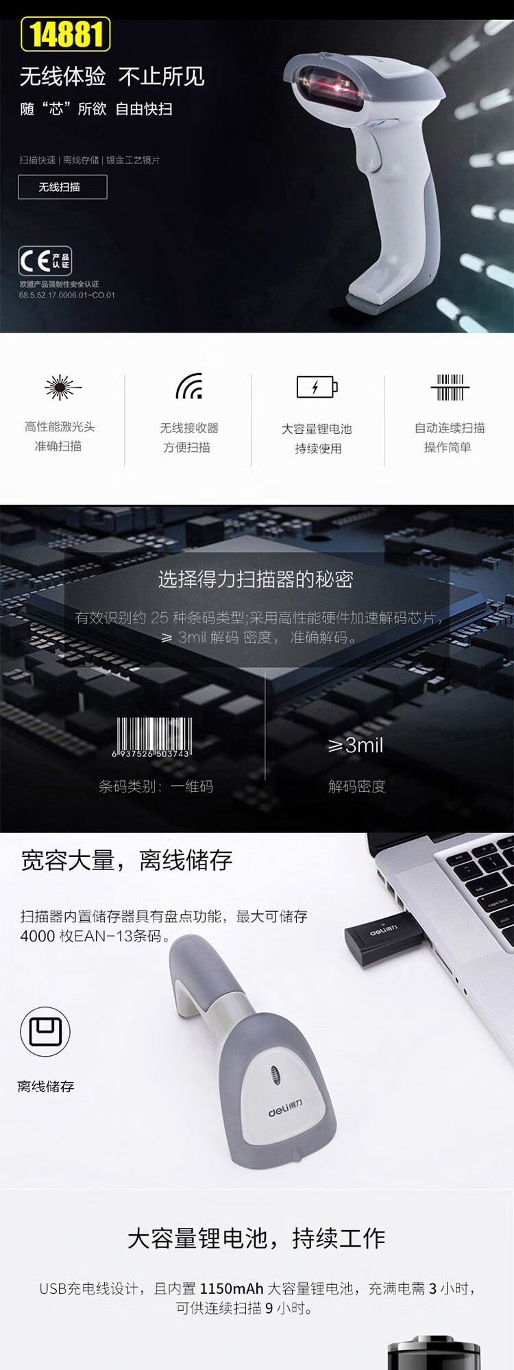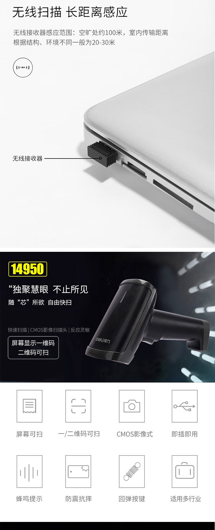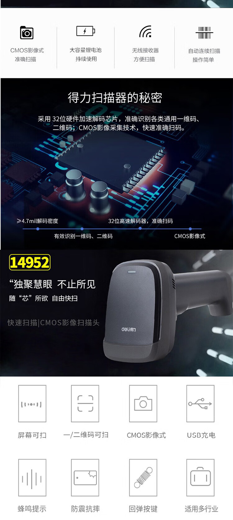 得力(deli)条码扫描枪扫码枪商品条码枪餐饮零售商超仓储物流手机屏幕支付商品扫描器14883有线一二维码手机支付农资扫描 自营