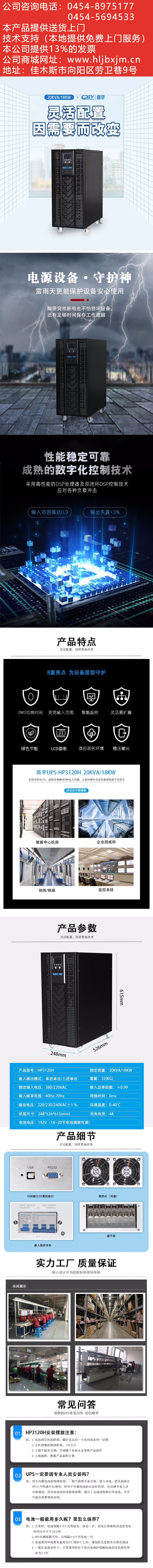 商宇UPS不间断电源HP3120H在线式高频机 电脑机房服务器备用电源需外接电池 支持定制 HP3120H 20KVA/18KW续航8小时 自营