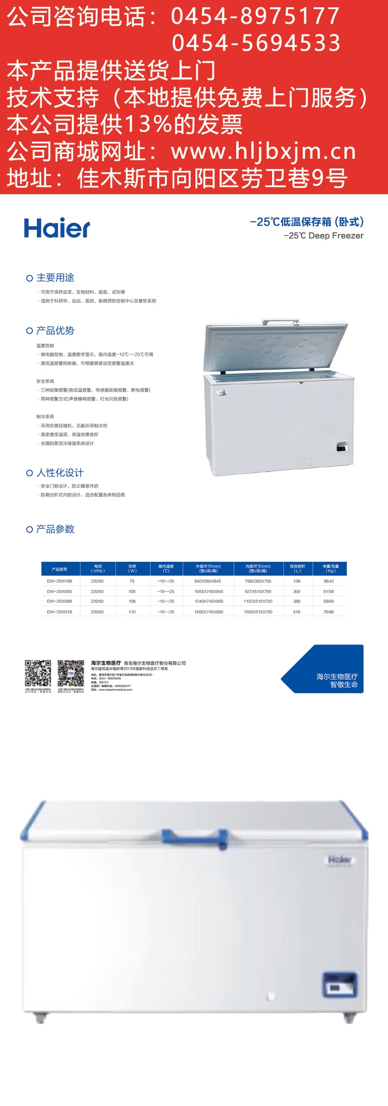 海尔生物医疗haier实验室医用低温保存箱零下2025 30 40 60度负 -30度冷冻冰箱 DW-25W518(-25度) 自营