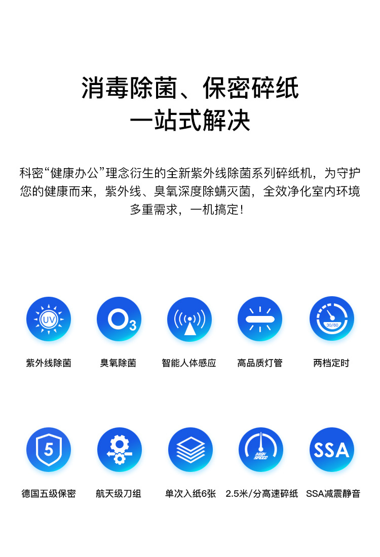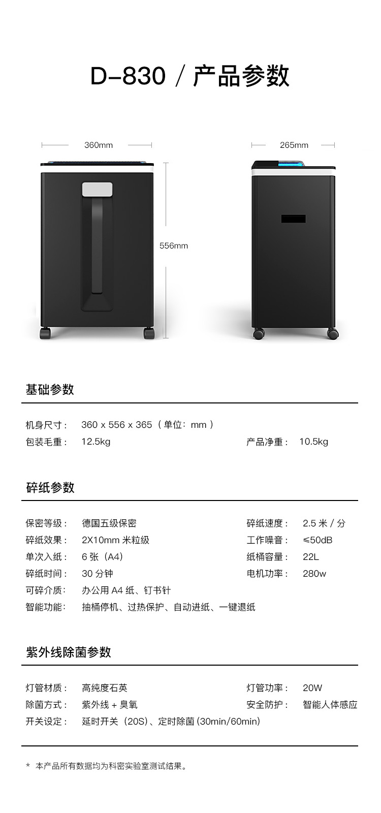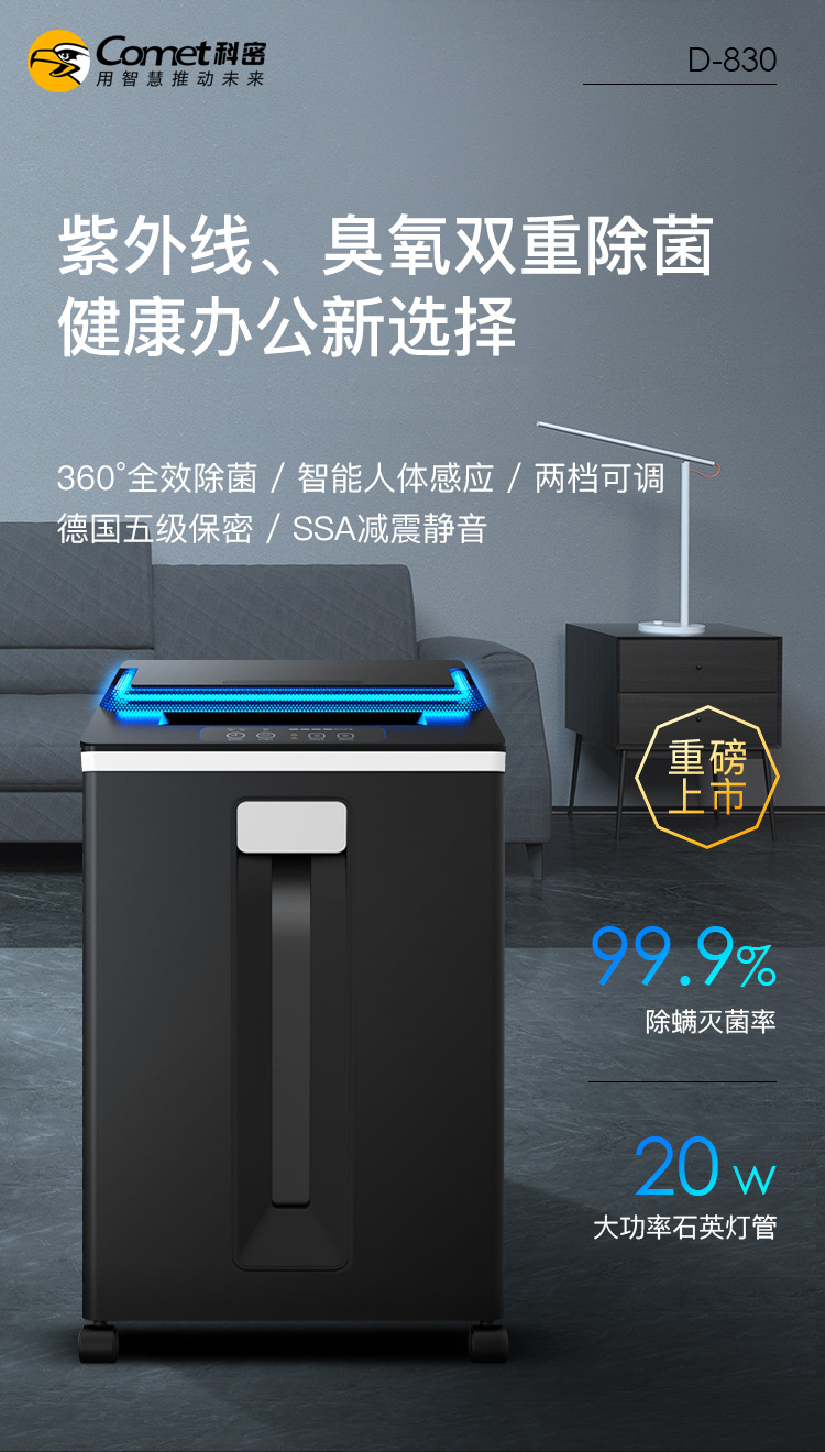 科密(comet)D-830 碎纸机 紫外线臭氧除菌除螨 德国5级高保密弹簧减震 办公商用家用纸张粉碎机 自营