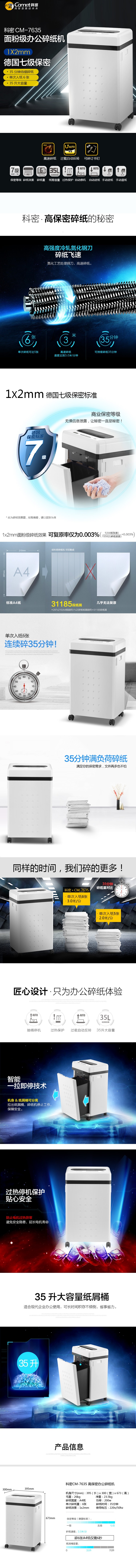 科密碎纸机CM-7635 7级保密办公商用 单次6张 持续35分钟 粉碎效果1mm*2mm 国保测认证保密等级二级 35L 自营