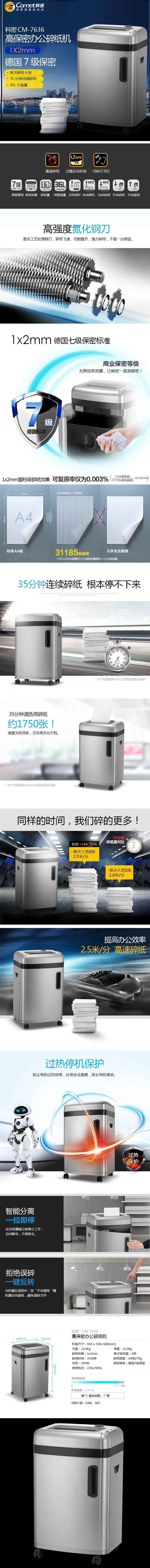 科密碎纸机CM-7636 7级保密办公商用 单次6张 持续35分钟 粉碎效果1mm*2mm 国保测认证保密等级一级 36L 自营