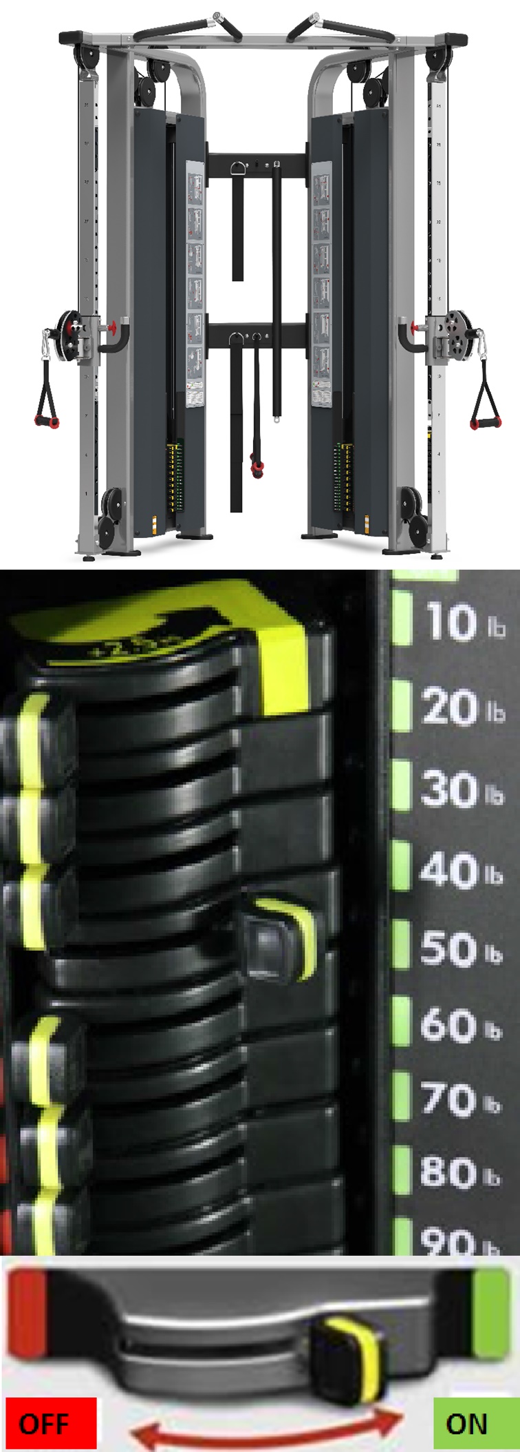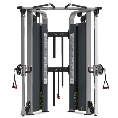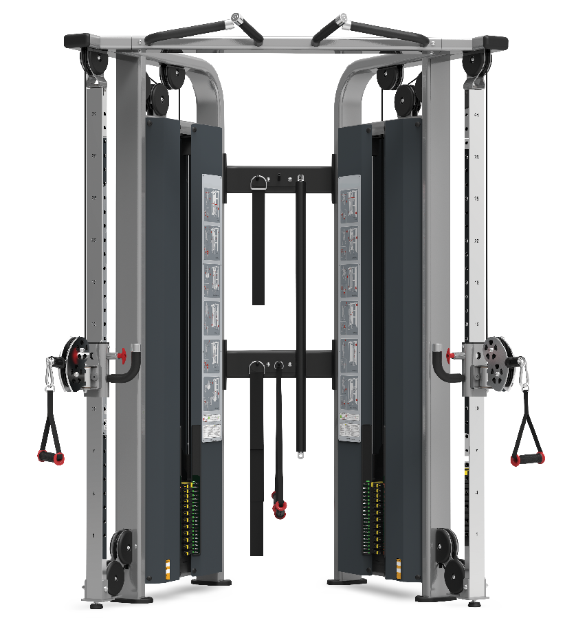 技术参数: ●外观尺寸(长宽高):66˝x 36˝x 81˝ (168 x 91 x 207 cm) ●重量:894 lb (406 kg) ●配重:2 x 200 lb (2x 100 kg) ●全球领先的“LOCK N LOAD”专利拨片式调节系统,调节重量无需拔上拔下,只需轻轻一拨即可。 ●采用40mm x 80mm,50mm x 100mm椭圆管,坚固稳定;部件均经激光精确切割,外观俊朗;精钢制造直径1"的滚轴配有25mm密闭轴承,密闭式轴承则能够确保滑轮工作时的平滑安静; ●滑轮采用玻璃纤维制造的强化滑轮配有深V字型凹槽,确保传动的稳定,并拥有出色的旋转性能。 ●舒适的橡胶材质的高把手。 ●低摩擦设计插拔螺栓,稳定安全。 ●动态的使用说明指示牌。 ●T形把手滑轮调整--便于单手调整 ●可连接的附件--可进行多种练习 ●大幅指导牌--对12种基本练习动作予以讲解,尤其适合无人指导的场所